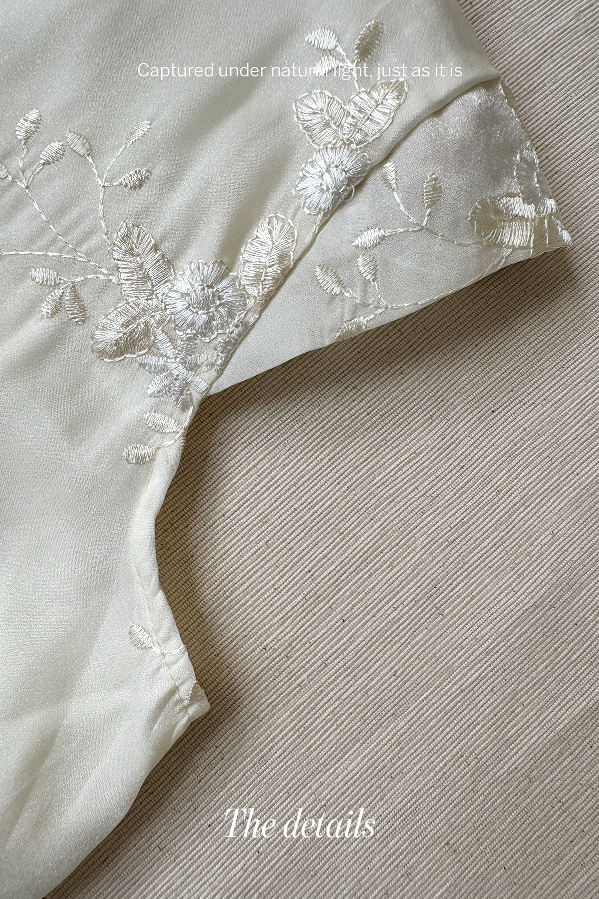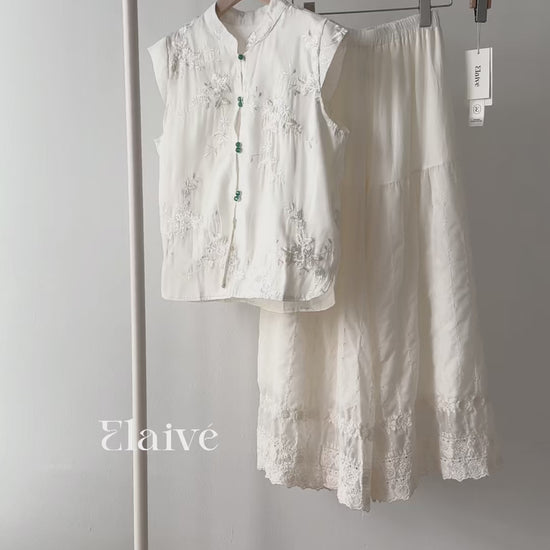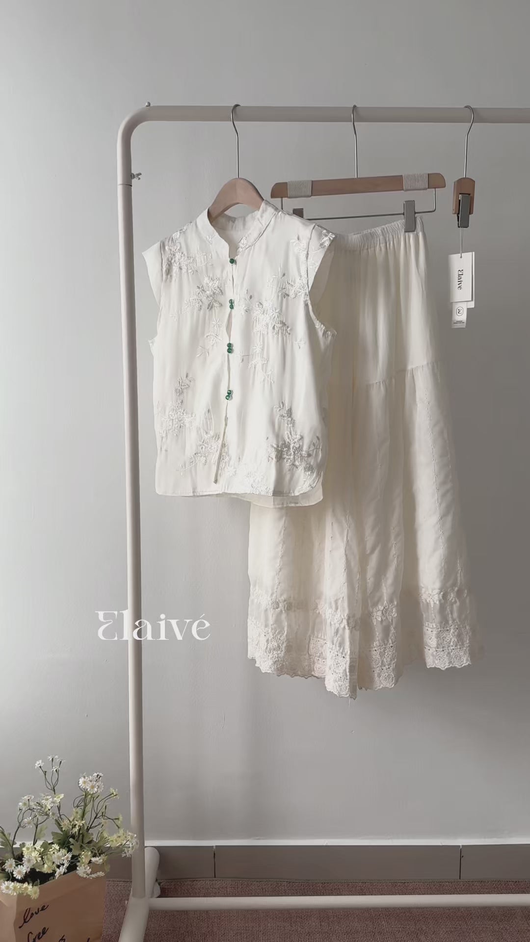 Beige trousers set with jade-green accents and subtle floral details, blending effortless elegance with modern ease.